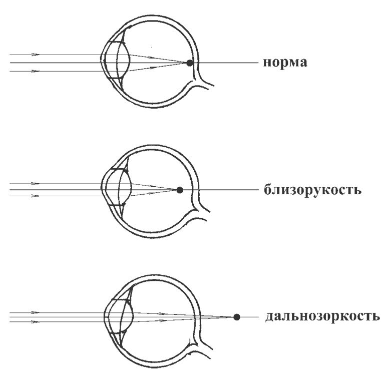 В медицине применяется понятие клинической рефракции, которое определяется положением фокуса по отношению к сетчатке. При этом нормальное положение фокусной точки на сетчатке называют эмметропией. Неправильное же положение, например перед сетчаткой или за ней, или отсутствие единого фокуса, называют аметропией. И в зависимости от отношения друг к другу сетчатки и фокуса выделяют три вида аметропии, соответственно: миопию (близорукость), гиперметропию (дальнозоркость) (рис. 2) и астигматизм.