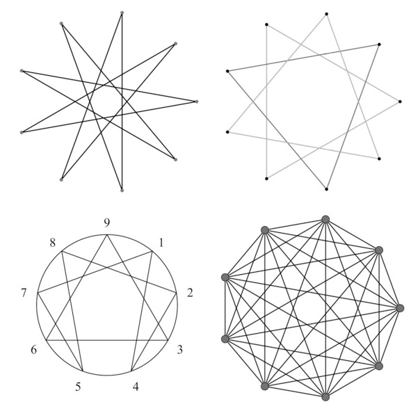 Термин происходит от греческих слов (девять) и (нарисованный символ, фигура, линия) и в геометрии относится к девятиконечному многоугольнику. Символ эннеаграммы использовался для описания добродетелей и пороков, как основных причин мотивационных динамик. Эннеаграмма упоминается во многих традициях мудрости как матрица сакрального знания об устройстве и развитии человека и как древний символ взаимосвязи космоса и человека. Эннеаграмма напоминает мандалы, описанные в буддизме и древнеиндийской традиции. «Мандала» представляет собой карту внутренних миров человека и космоса. эннеаграмма ennea grammos 1