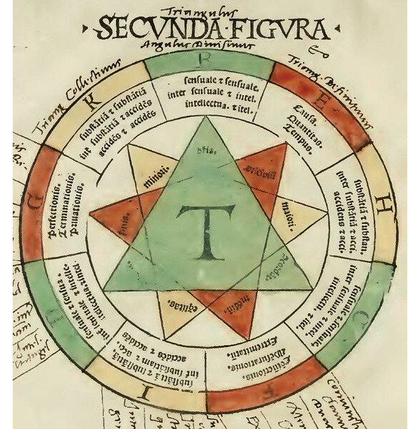 В работах каталонского философа Раймунда Луллия (Raymundus Lullius) (1235—1316) описана система, в которой девять фундаментальных категорий, соответствуют всем явлениям и качествам вселенной. Знание этой системы, считал Луллий, способно привести духовного искателя к Истине. Символ эннеаграммы использовался для описания добродетелей и пороков, как основных причин мотивационных динамик. В «Ars Magna» Луллий связывает эннеаграмму с 9 смертными грехами, 9 добродетелями, 9 достоинствами, 9 недостатками, 9 основополагающих объектов мироздания, 9 сущностных качеств и т. д. Луллий считал, что понимая эти категории и их сочетания, человек может раскрыть новые знания. Точка зрения Луллия заключалась в том, что мистицизм, философия и теология не противоречат друг другу, а различаются только своим подходом к одному и тому же знанию. Это просто разные пути, но цель у каждого одна: вознесение души к Источнику и объединение всех знаний в единую систему. Все Луллиевы искусства основываются на именах или атрибутах Бога, на таких понятиях, как bonitas, magnitudo, eternitas, potestas, sapientia, voluntas, virtus, veritas, gloria (благость, величие, вечность, сила, премудрость, воля, добродетель, истина, слава). Эти понятия Луллий называет «божественными достоинствами». Они составляют основу для «девяти» форм искусства. Остальные его формы добавляют к этому перечню иные божественные имена или атрибуты и основываются на большем количестве таких имен или достоинств. 2