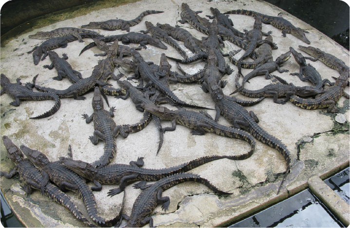Ферма была организована по возрастному принципу. В одном из помещений в бассейне и вокруг него застыли в разнообразных позах крокодильчики до года. В следующем подростки примерно лет до трёх. После яслей находились группы детского сада. Так до взрослых особей, среди которых встречались почтенные дедушки огромных размеров.