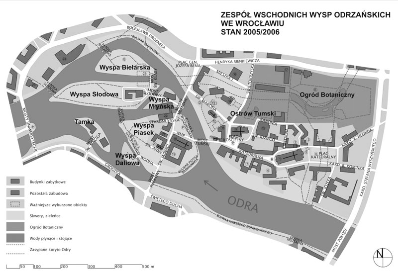 Центр Вроцлава (в отличие от центра Томска) строго определен, визуально выделен и сакрально маркирован. Сакральность, сосредоточенная и «стабилизированная» в центре городской территории (которая, в свою очередь, никогда не может быть понята как окончательно определенная по своей площади и конфигурации), затем как бы «излучается» из этого средоточия через Одру в сторону административно-делового (а с XVIII века – и образовательного) городского сегмента, поддерживая и укрепляя этот сегмент выдвинутыми в его сторону и «вставленными» в его пространство костелами – опорными точками, которые держат на себе единство, связность всего «старого города»[4]. При всей очевидно парной, «двухъядерной» структуре центра Вроцлава (ил. 3) ведущим в этой паре изначально является именно сакральный компонент.