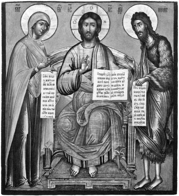 Ил. 6. Деисус: Христос на престоле с предстоящими Пресв. Богородицей и св. Иоанном Крестителем. Оружейная палата Московского Кремля, 1685. Москва, Смоленский собор Новодевичьего монастыря, Софийский придел. Источник: Государственный Исторический музей. Москва, 2006 http://www.icon-art.info/masterpiece.php?lng=ru&mst_id=5179