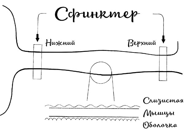 Чтобы проглотить пищу, недостаточно силы тяжести, поэтому внутри пищевода есть отрицательное всасывающее давление, которое удерживается двумя клапанами. Эти клапаны называются сфинктерами: один расположен сверху, а второй – снизу пищевода. Это не клапаны с крышечкой, как на чайнике или какой-нибудь трубе. Скорее, они представляют собой клапан-манжетку, который давит и сжимает с определенной силой. Поскольку внутри пищевода давление отрицательное, верхний пищеводный сфинктер нужен для того, чтобы человек не заглатывал избыточное количество воздуха, иначе это спровоцирует отрыжку. А нижний пищеводный сфинктер нужен скорее желудку, чем самому пищеводу. О желудке речь пойдет дальше. Говоря о проблемах пищевода, вспоминают почему-то только нижний пищеводный сфинктер, который закрывается или не закрывается. Однако верхний пищеводный сфинктер тоже может не закрываться.