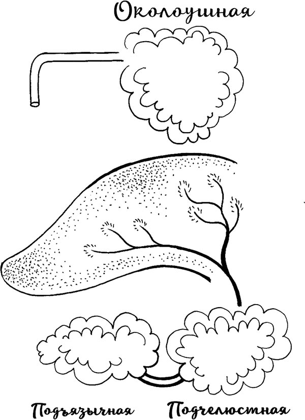 Большие слюнные железы подсоединяются к этим же нервам и в зависимости от вкуса, который мы чувствуем языком, и от ожиданий, которые формируются в нашем мозгу от еды, например при поглощении лимона, выделяют большее или меньшее количество слюны.