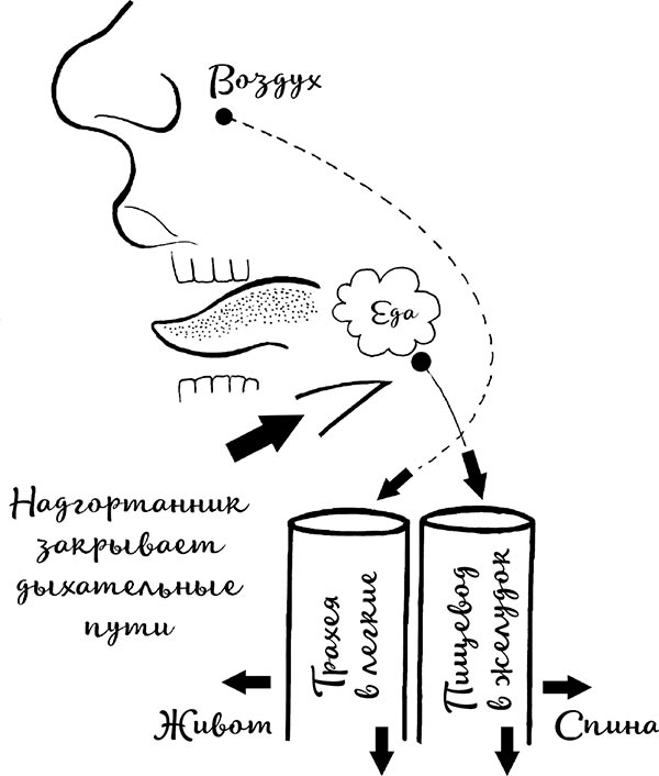 Во время глотания язык поднимается кверху и отделяет полость рта от горла. Надгортанник отделяет трахею и дыхательные пути от пищеварительной системы. Для этого при глотании он наклоняется вперед. За счет того, что расслабляется верхний пищеводный сфинктер, а в пищеводе отрицательное давление, пища как бы засасывается в пищевод. Пищевод, который продолжает рот и глотку, дальше идет параллельно дыхательным путям вниз к желудку.
