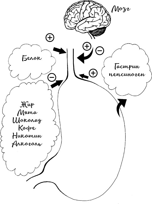 Работа пищевода регулируется тремя компонентами. Первый компонент – это та пища, которая в него попадает. Например, если мы съели белок, это усиливает сокращения пищевода. Расслабляют сокращения пищевода жиры, шоколад, мята, алкоголь и никотин. Второй – желудок влияет на работу пищевода снизу, выделяя гормоны гастрин и пепсиноген, которые усиливают сокращения пищевода. И, наконец, самый главный – это нервная система, которая оказывает влияние на пищевод. Блуждающий нерв, выходящий из мозга, регулирует деятельность желудочно-кишечного тракта. Нерв проходит рядом с пищеводом и расслабляет его, расслабляет нижний пищеводный сфинктер, от которого зависит ситуация с рефлюксом.