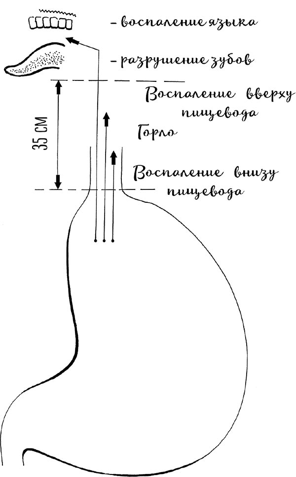 При рефлюксной болезни возникает заброс кислоты снизу вверх из желудка в пищевод. Чаще всего кислота повреждает нижние 2–3 см пищевода, примыкающие к желудку. Но встречается и более сильный заброс кислоты, достигающий даже горла. Тогда многие люди чувствуют изжогу в области горла, может даже появиться кашель из-за раздражения голосовых связок кислотой.