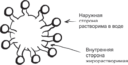 Мицеллы похожи на двухсторонних ежиков-перебежчиков. Это микрошарики размером 3–6 нанометров, состоящие из 20–40 молекул. Они образованы из желчных кислот и лецитина, которые имеют трехмерную структуру и две стороны – жирорастворимую и водорастворимую. Эта структура свернута так, что серединка у нее жирорастворимая, а наружная поверхность водорастворимая. Если в окружающем пространстве больше воды, жирная часть уходит внутрь, а водная – наружу. Если жира снаружи больше, то водная часть прячется внутрь.