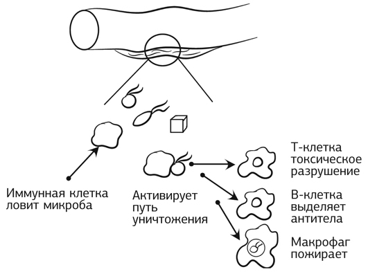 Работает иммунитет кишечника следующим образом. Чужой белок или антиген поступает в кишечник вместе с едой, это и есть еда, и вместе с бактериями и микробами. Специальные М-клетки захватывают его и транспортируют в пейеровы бляшки и одиночные фолликулы. Иммунные клетки в пейеровых бляшках и брыжеечных лимфоузлах анализируют поступившее вещество и передают информацию Т-клеткам. Затем запускается реакция, направленная на уничтожение антигена: образуются токсические Т-клетки, активируются пожирающие макрофаги, выделяется противовирусный интерферон, синтезируются иммуноглобулины.