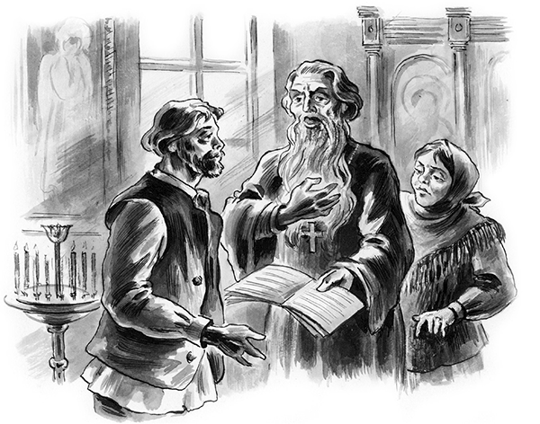 Отец Сергий горячо любил пение и, несмотря на эти недостатки, вместе с Костей старался не пропускать ни одной спевки. Возвратившись, он иногда с удовольствием напевал понравившуюся ему мелодию, а иногда комментировал: «Марш какой-то!» И, расхаживая по комнате, наглядно доказывал, что под эту музыку очень удобно маршировать. А однажды пропел фразу из песнопения (не буду указывать, из какого, чтобы не смутить тех, которые его услышат) и спросил Юлию Гурьевну и Соню: «Что это?»