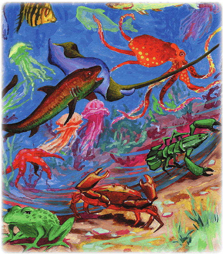 Утром пятого дня в реках и морях заплескалась рыба, самая разная, большая и маленькая. От карасиков до китов. По морскому дну поползли раки. Заквакали в озёрах лягушки.