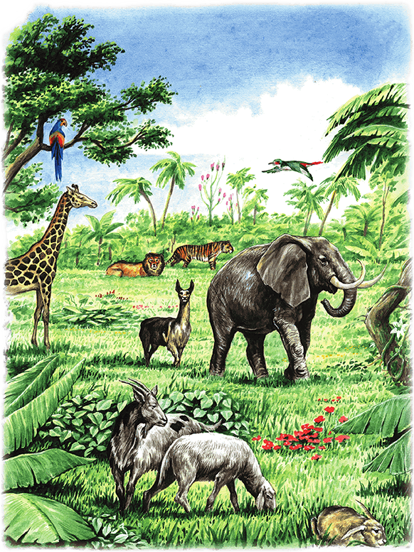 На краю поляны прилёг отдохнуть лев. В лесной чаще притаились тигры. Неторопливо пошли на водопой слоны, с ветки на ветку запрыгали обезьяны.