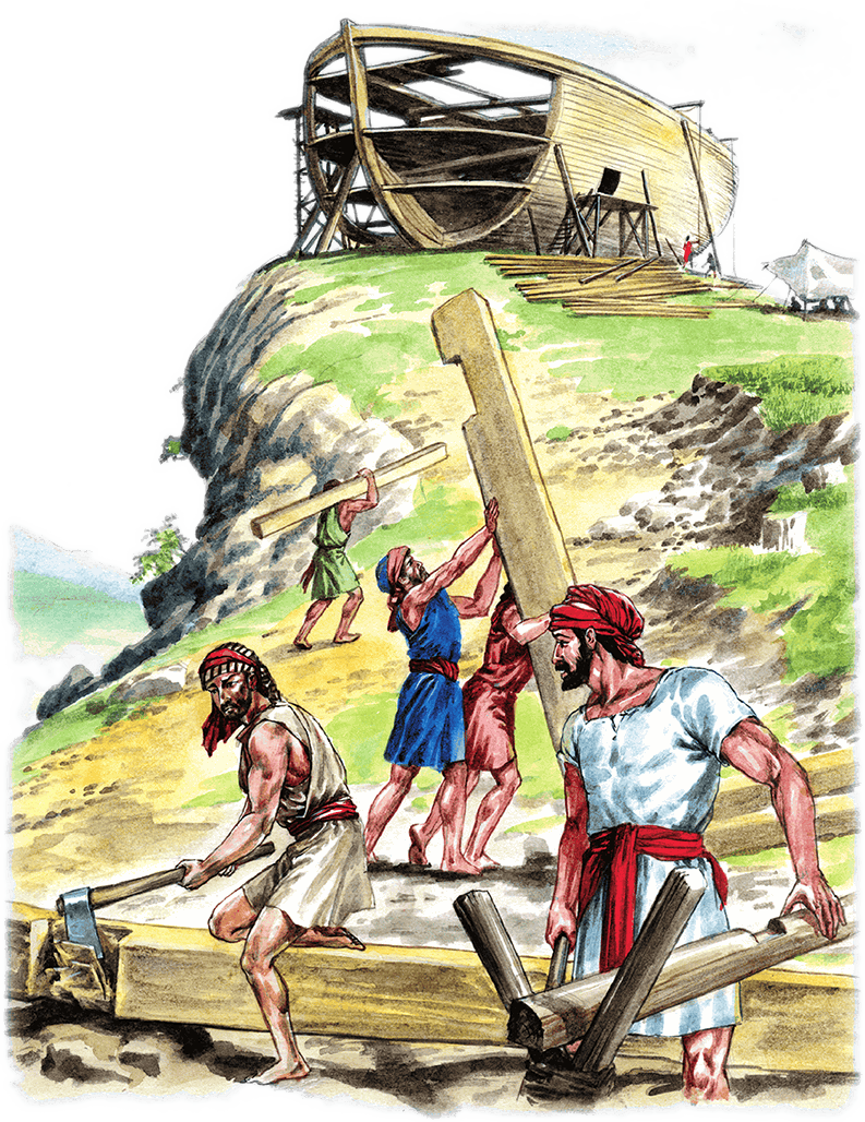 Наутро Ной и его сыновья принялись за работу. Рубили высокие деревья, делали из них брёвна и несли их на берег.