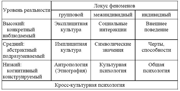 Представленная таблица задана тремя уровнями реальности культуры (от наиболее конкретного, хорошо наблюдаемого, до когнитивно конструируемого) и тремя потенциально возможными видами локализации феноменов – групповым, межиндивидным и индивидным. На пересечении этих двух параметров лежат хорошо известные понятия.