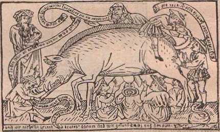Громадное количество карикатур на духовенство может составить объемистый том, и мы поневоле должны ограничиться лишь избранными. Иногда карикатуры на духовных особ изображались символически. Папы, кардиналы, аббаты и монахи являются на некоторых сатирических рисунках и скульптурных произведениях под видом животных. Эта форма, как нам уже известно, берет начало в глубокой древности.
