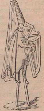 Против такого бесстыдства произносились речи с церковных кафедр, издавались эдикты и рисовались карикатуры. Помещаемая здесь карикатура (рис. 12) из манускрипта XIV века осмеивает один из многочисленных родов причёсок того времени. Большинство дам в Англии той эпохи стало делать прически в форме колокольни или, вернее, спиральной башни, которая устраивалась при помощи куска полотна, свёрнутого в трубочку. На верхушке такой колокольни привязывался кусок тонкой кисеи или муслина, спускавшийся почти до земли и образовывавший, так сказать, два крыла. Маленькая прозрачная вуаль набрасывалась на лицо, не закрывая, однако, подбородка.