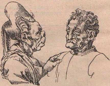 Для Леонардо да-Винчи, как истинного сына своей эпохи, желавшего всё постичь и всё знать, карикатура интересовала как художественная проблема. К смешному или уродливому органу, будь то нос, ухо или рот, артист старался нарисовать всю фигуру или все лицо, которые бы во всех своих составных частях были уродливы или смешны, и при этом нередко достигал поразительных результатов (рис. 16). Что с его стороны это были не отдельные художественные эскизы, а строгое систематическое изучение проблем карикатуры, доказывает нам громадное число сатирических рисунков, оставшееся после смерти Леонардо да-Винчи.