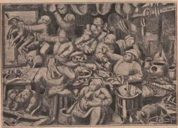 Брюкхель известен своими фантастическими рисунками, представляющими в нескольких версиях соблазнение святого Антония, но эти рисунки, вследствие своей аллегоричности, далеко не так понятны, как две другие его карикатуры- «Сухощавые» и «Толстяки» (рис. 23, 24), производящие громадное впечатление своим бьющим в глаза контрастом. Если рисунки на святого Антония нуждаются в комментариях, то «Толстяки» и «Сухощавые» по своей простой идее и великолепному исполнению не требуют никаких объяснений. Кроме того, эти две карикатуры представляют собою зародыш социальной художественной сатиры, которая немного позднее с большим успехом культивировалась лотарингцем Калло, одну из карикатур которого, а именно карикатуру на моды, мы приводим в этой главе (рис. 25).