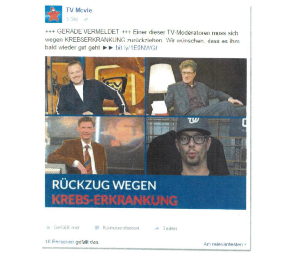 2 Ответчик издает журнал с ТВ-программой «TV Movie» и наряду с Интернет-страницей www.tvmovie.de имеет аккаунт в социальной сети Facebook. 18 августа 2015 г. ответчик разметил пост в Facebook со следующим текстом: «СРОЧНАЯ НОВОСТЬ! Один из этих телеведущих уходит с вещания в связи с заболеванием раком. Мы желаем ему скорейшего выздоровления!»