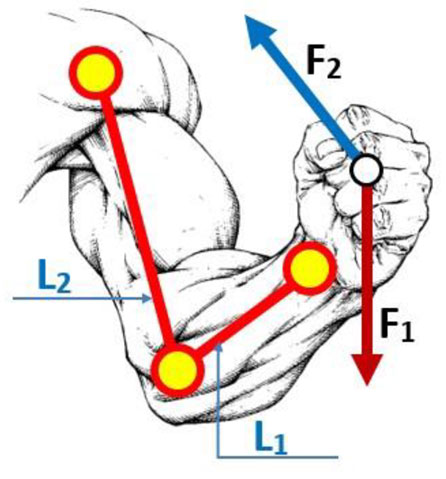 Благодаря мышцам, прикрепленным к костным рычагам и выполняющим роль своеобразных биомеханических тяг, оживляется вся «конструкция» человека. Чем больше длина L1 костного рычага (рис. 2), тем сильнее должна напрягаться мышца для преодоления сопротивления, создаваемого внешней нагрузкой F1. При этом костные рычаги, соединенные суставами, перемещаются в направлении сокращающихся мышечных пучков. Самое простое движение выполняют пальцы, фаланги которых сгибаются при напряжении соответствующих мышц сгибателей, расположенных на внутренней стороне пальцев. Более сложные пространственные движения совершают руки (кисти, предплечье, плечо), а также туловище и ноги, вовлекая в работу множество групп мышц, прикрепленных к различным точкам костных рычагов.