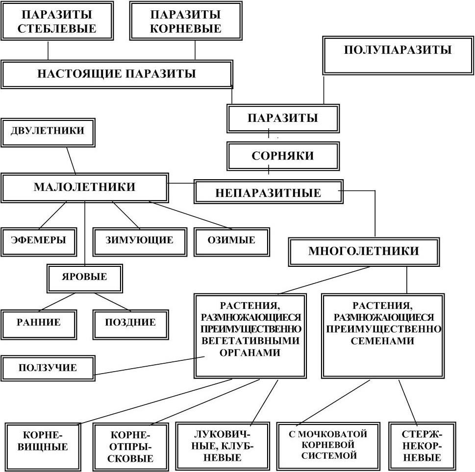 Наиболее удобной классификацией сорняков является биологическая, в основу которой положены способы питания и размножения, и продолжительность жизни.