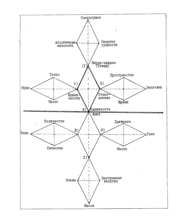 Первая диалектическая тетрактида Лосева оказывается не просто погружённой в многообразие реальности, – она сама становится настоящим центром кристаллизации, выявляющим внутреннюю упорядоченность как в сфере смысла, так и в сфере факта. Я пытаюсь для наглядности отразить это схематически, используя (при отдельных исключениях) лосевские наименования категорий (см. схему):