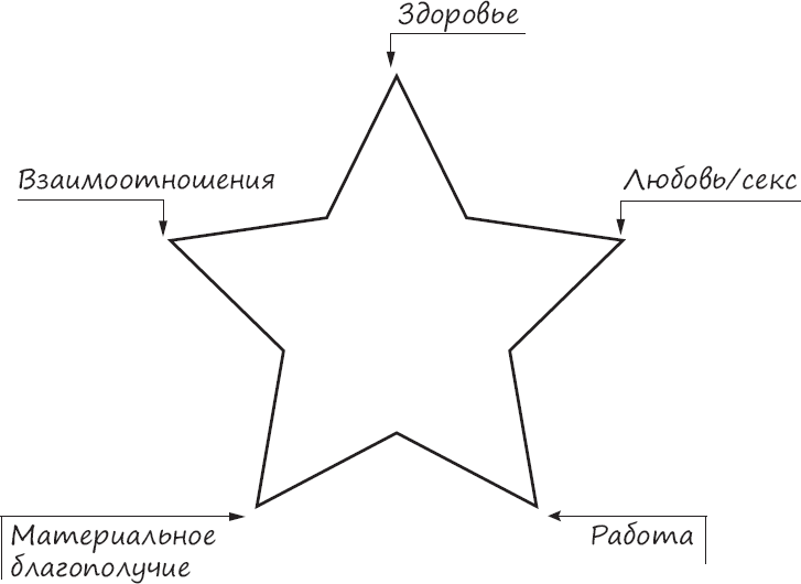При этом обнаружилось, что благополучие и его уровни можно (и нужно) рассматривать не только, так сказать, в целом, но и по отдельным его (благополучия) аспектам – здоровью, взаимоотношениям, любви/сексу, работе и материальному благосостоянию. Всему тому, что я – еще во времена оные – представил в виде так называемой рабочей модели «Звезда благополучия – СК (Сергей Ковалев)» (рис. 3).
