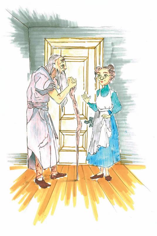 Однажды ночью, в самую непогоду, когда лил дождь и ветер с ног сбивал, к нему в дом постучали. Дверь открыла кухарка. Перед ней стоял высокий седой Старик с посохом. Его глаза смотрели на неё пронзительно. Казалось, они излучали свет, да так, что кухарка прикрыла глаза.