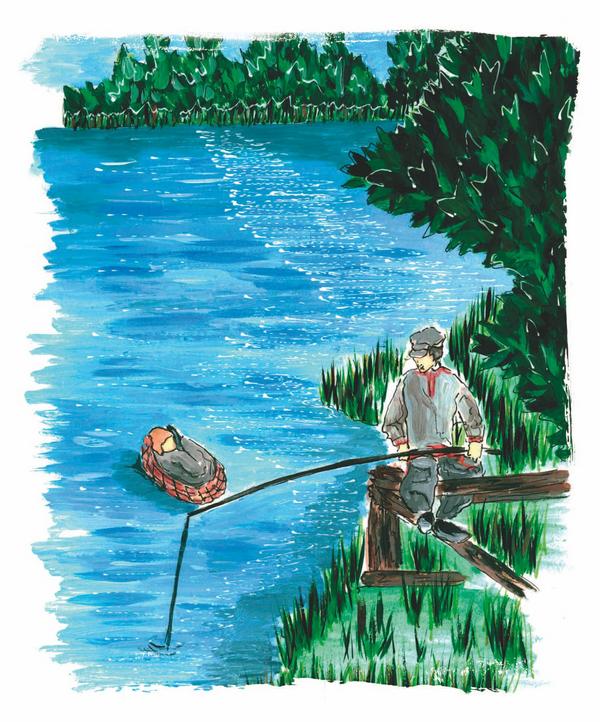 В это время на мостках сидел рыбак, ловил для Купца рыбу. Видит: корзинка плывёт по реке. Выловил он корзинку, смотрит, а там младенец! Принёс он домой корзину с ребёнком, показал жене.