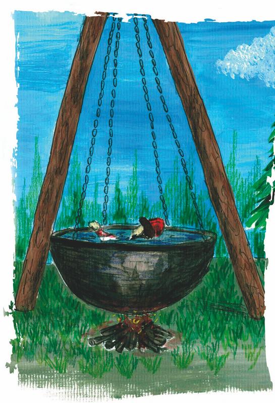 А Купец не спит ночью, сомнения его гложут… Не дождался он утра. Переоделся в одежду попроще, на глаза надвинул шапку и поспешил на смоловарню. Приезжает, а мужики не узнали его, схватили и, как велено было, в бочку со смолой кипящей сунули. И не слушали его, что он ни кричал!