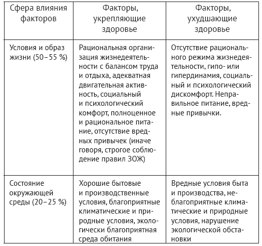 Во-первых, это образ жизни, который человек создаёт себе сам – он более чем на 50 % определяет состояние здоровья. Во-вторых, это наследственно обусловленные биологические факторы – от них здоровье зависит на 20 %. Ещё на 20 % здоровье зависит от третьего фактора – внешних экологических условий проживания. И, наконец, четвёртый фактор – состояние медицины; его влиятельность составляет 10 %.