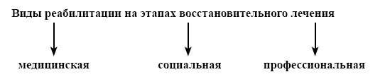 Основное направление реабилитации (медицинской и физической) – восстановление здоровья больного посредством комплексного использования различных средств, направленных на максимальное восстановление нарушенных физиологических функций организма, а в случае невозможности достижения такого результата – развитие компенсаторных и заместительных приспособлений (функций). Психологический аспект реабилитации направлен на коррекцию психического состояния пациента, формирование его отношения к лечению, врачебным рекомендациям, выполнению реабилитационных мероприятий. Необходимо создать условия для психологической адаптации больного к изменившейся вследствие болезни жизненной ситуации. Социально-экономическая реабилитация направлена на возможность вернуть пострадавшему экономическую независимость и социальную полноценность.