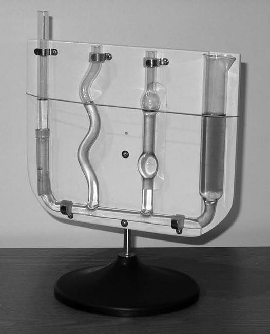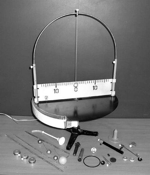 Кроме перечисленных выше комплектов и наборов, в состав блока входят независимые друг от друга приборы, позволяющие демонстрировать: падение различных тел в вакууме (трубка Ньютона, рис. 4.31); упругое взаимодействие легкоподвижных тележек (рис. 4.32); виды и условия устойчивости твердых тел (рис. 4.33); переход потенциальной энергии тела в кинетическую энергию поступательного движения центра масс и вращения (маятник Максвелла, рис. 4.34); звуковые колебания частотой 440 Гц (камертон «ля» первой октавы, рис. 4.35); моделирование колебательных и волновых движений с возможностью изменения частоты и амплитуды колебаний (машина волновая, рис. 4.36); устройства простых механизмов (рычаг, наклонная плоскость, блок, полиспаст); трения покоя и скольжения; зависимость силы трения от состояния трущихся поверхностей и силы давления (трибометр, рис. 4.37); изменение давления внутри жидкости с глубиной погружения (рис. 4.38); передачу давления жидкостями (шар Паскаля, рис. 4.39); закон сообщающихся сосудов (рис. 4.40); действие жидкости на погруженное в нее тело, измерение выталкивающей силы, закон Архимеда (рис. 4.41).