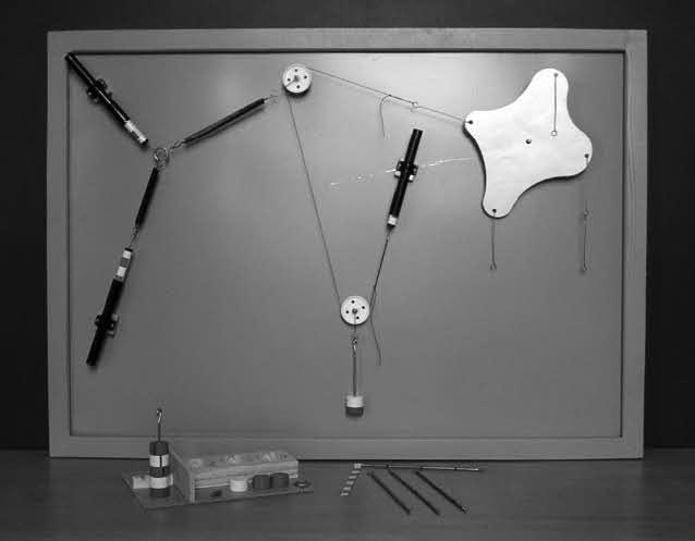 Набор по статике (рис. 4.30) предназначен для формирования понятий «момент силы», «центр тяжести», правил сложения сил; используется при изучении равновесия твердого тела. В состав набора входят: три трубчатых динамометра (предел измерения 3 Н, цена деления 0,5 Н, погрешность 0,25 Н); два постоянных магнита; два блока со съемными петлями; два набора из пяти грузов массой по 50 г; одна пластина неправильной формы весом 0,5 Н с отверстием; один стержень с петлями; один угольник для измерения плеч; две пружины; три нити длиной 140, 240 и 270 мм; пять проволочных крючков; стальной лист 42 × 90 см.