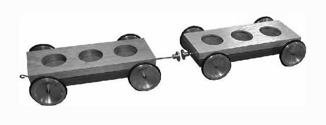Комплект для изучения поступательного движения (рис. 4.28) включает в себя скамью длиной 1,2 м с двумя тележками массой по 0,12 кг, движущимися на магнитной подвеске, неподвижный блок и основание для подвешивания стальных шаров на определенном расстоянии друг от друга. Все эти элементы крепятся на магнитах к металлической классной доске. В комплект входит груз для тележек, позволяющий увеличивать массу тележки в два раза, два груза изменяемой массы для подвешивания их на нити, перекинутой через блок, два шарика одинаково й массы диаметром 18 мм и шарик, масса которого в 4 раза меньше. Для проведения измерений в комплекте имеются два датчика момента времени, позволяющие регистрировать движение тележек, шариков и вращение блока. Каждая из тележек имеет два съемных флажка, а на блок установлен диск с чередующимися прозрачными и непрозрачными секторами. Датчики подключаются к компьютерному измерительному блоку или цифровому секундомеру.