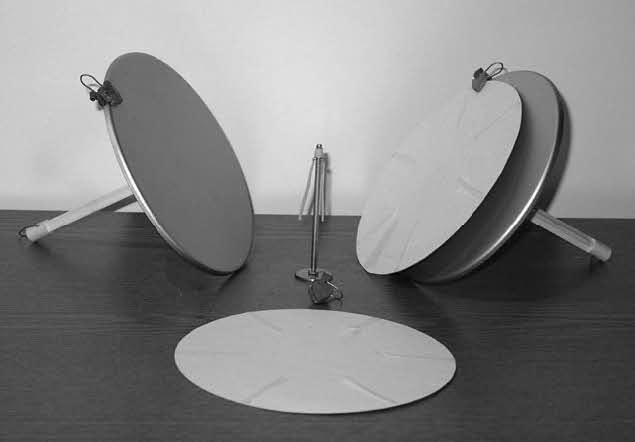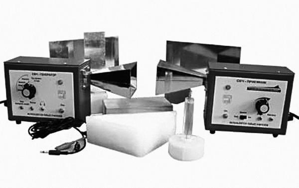 Набор приборов для демонстрации свойств электромагнитных волн трехсантиметрового диапазона (рис. 4.56) включает: генератор с рупорной антенной, приемник с рупорной антенной, приемник с дипольной антенной, зеркало металлическое большое, зеркало металлическое малое, лист из диэлектрика, диск металлический в сборе, решетку поляризационную, призму прямоугольную, призму треугольную, линзу диэлектрическую, держатель, стержень, подставку в сборе. Набор имеет следующие технические характеристики: несущая частота генератора 10 ГГц ± 60 МГц; средняя мощность излучения 10 мВт; модулирующие сигналы от 1 до 2 кГц; скважность сигнала от 2 до 4; амплитуда сигнала на выходе приемника не меньше 15 мВ при его расстоянии до передатчика 3 м; напряжение питания 42 В.