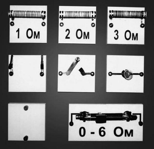 Набор для изучения законов постоянного тока (рис. 4.51) состоит из унифицированных модулей-платформ, на верхней поверхности которых закреплены отдельные элементы электрических цепей и установлены клеммы для подключения соединительных проводов. В основаниях платформ запрессованы магниты, что позволяет размещать их на вертикальной доске или стенде с металлическим покрытием. В набор входят следующие элементы: проволочный резистор 1 Ом, проволочный резистор 2 Ом и проволочный резистор 3 Ом, переменный резистор 0–6 Ом, выключатель, лампа 12 В/21 Вт, платформа с зажимами, платформа с клеммами для подключения источника питания. Размеры платформы 110 × 110 × 20 мм. Сопротивление проволочных резисторов отличается от номинала не более чем на 1 %.