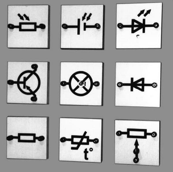 В основаниях платформ запрессованы магниты, что позволяет размещать их на вертикальной доске или стенде с металлическим покрытием. В набор входят платформы, на которых установлены: полупроводниковый диод, транзистор, светодиод, фоторезистор, терморезистор, фотоэлемент, резистор 360 Ом, переменный резистор 0–470 Ом, лампа накаливания 3,5 В/0,25 А. Размеры платформы 110 × 110 × 20 мм. Набор позволяет демонстрировать: