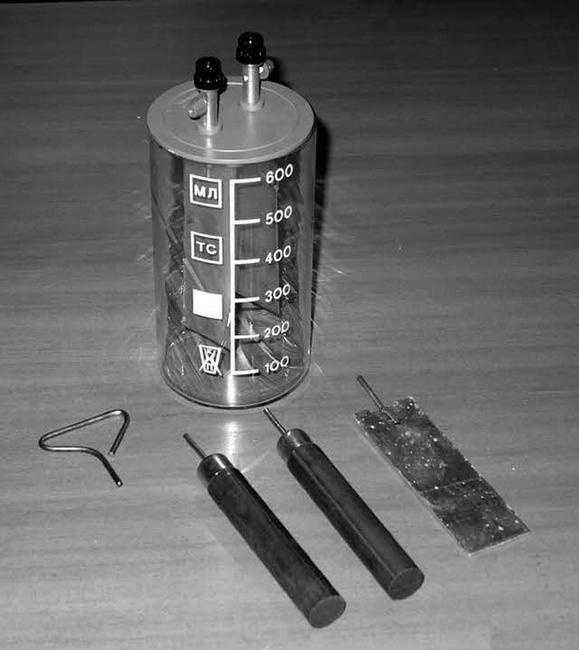 Набор для исследования токов в электролитах (рис. 4.53) состоит из стакана, держателя для электродов и электродов (медный, угольный и цинковый).