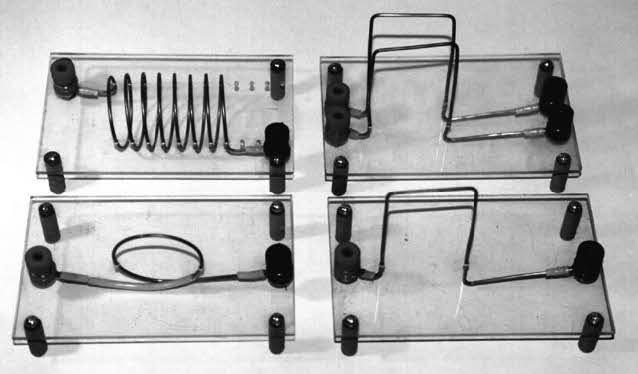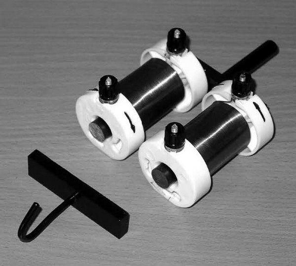Кроме перечисленных выше комплектов и наборов, в состав блока входят независимые друг от друга приборы, позволяющие демонстрировать: взаимодействие параллельных токов (проводники, рис. 4.59) и рамки с током (рис. 4.60), устройство электромагнита (разборный электромагнит, рис. 4.61), преобразование энергии постоянного тока в автоколебательный процесс (генератор автоколебаний и электрический звонок, рис. 4.62), зависимость направления индукционного тока от характера изменения магнитного потока (правило Ленца, рис. 4.63), устройство и действие трансформатора (трансформатор разборный, рис. 4.64), принцип действия электродвигателя и индукционного генератора (магнитоэлектрическая машина, рис. 4.65).