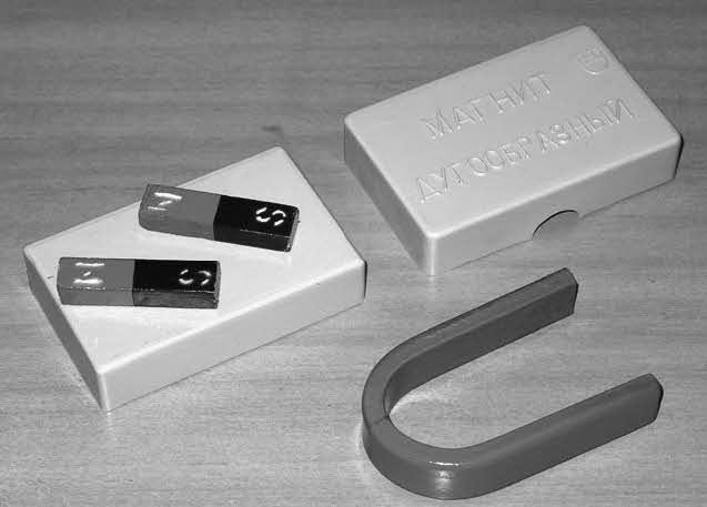Набор приборов для изучения магнитных полей (рис. 4.54) включает: комплект для моделирования магнитных полей (модели проводников разной формы) (рис. 4.54а), прибор для определения горизонтальной составляющей индукции магнитного поля Земли (рис. 4.54б), стрелки магнитные на штативах (2 шт.) (рис. 4.54в), магниты дугообразные и прямые (2 шт.) (рис. 4.54 г).