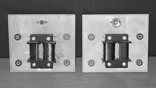 Набор по передаче электрической энергии (рис. 4.58) состоит из двух одинаковых трансформаторов, установленных на панелях с двумя парами штепсельных гнезд, к которым подведены концы обмоток. Катушка каждого трансформатора рассчитана на 42В и 4 В. Набор демонстрирует применение трансформатора для передачи электрической энергии на большие расстояния.