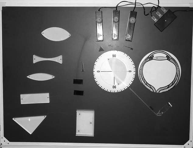 В набор по геометрической оптике (рис. 4.66) входят: осветители с диафрагмами – 3 шт., соединительная колодка, плоскопараллельная пластина, полуцилиндрическая пластина, треугольная призма, собирающие линзы (3 шт.), рассеивающая линза, кювета, набор цветных светофильтров, зеркало, световод, лимб, модель глаза, магнитные полоски. Элементы набора имеют магниты и закрепляются на металлической доске.