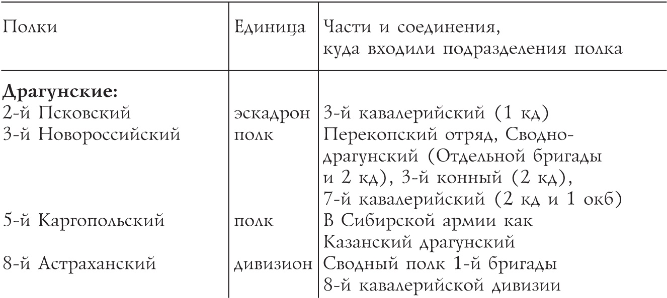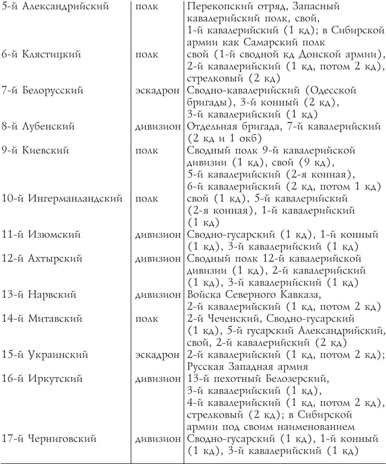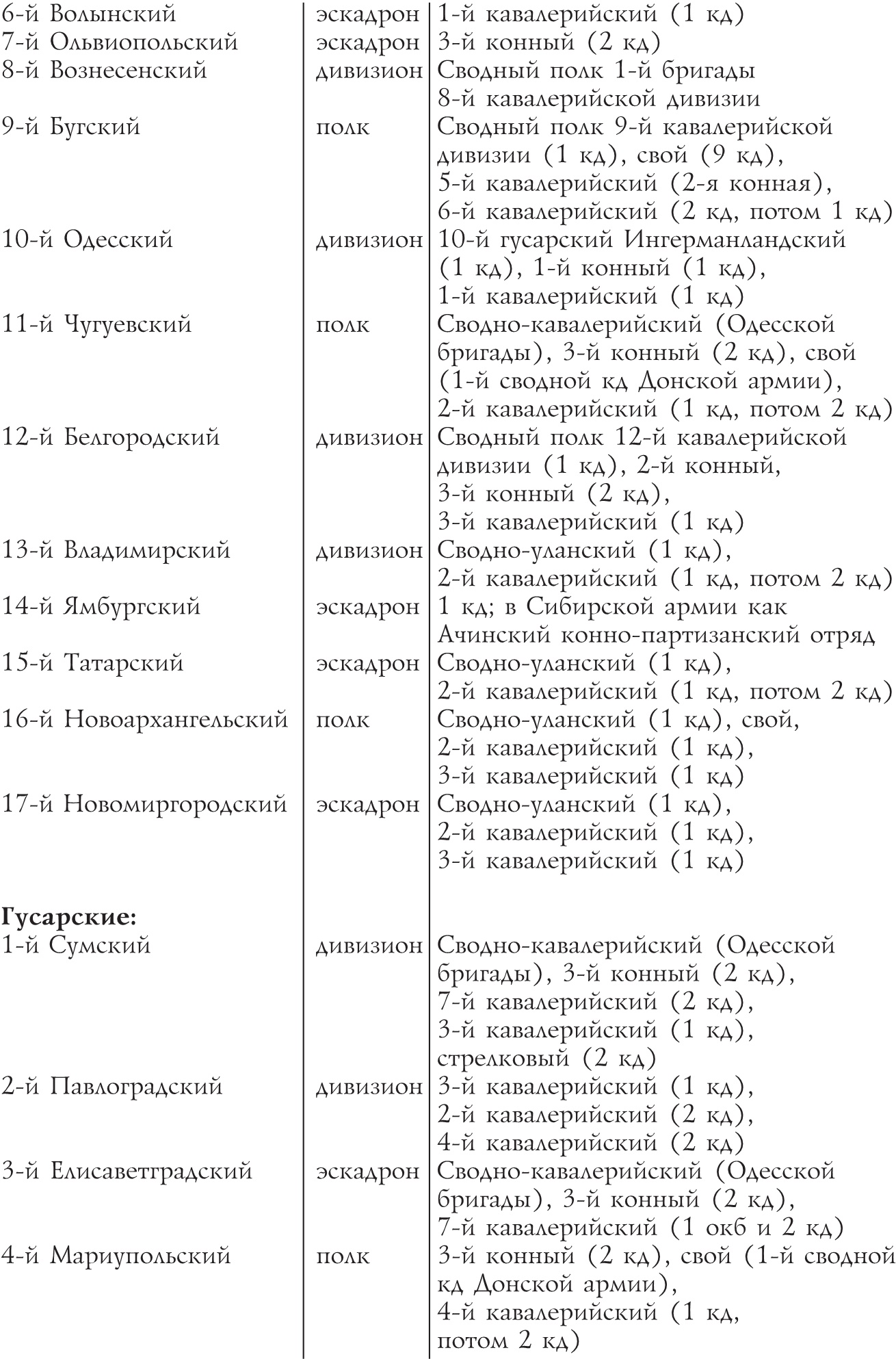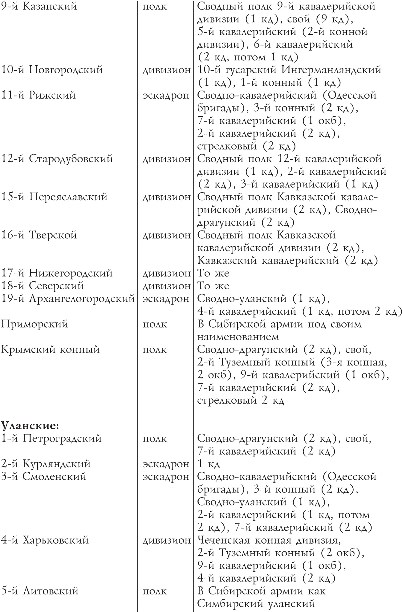 Надо сказать, что возрождение кавалерийских полков встречало на первых порах противодействие командования, опасавшегося распыления кавалерийских офицеров по мелким формированиям. Но в дальнейшем именно кавалеристы дали наибольшее количество возрожденных полков. Почти все из возрожденных кавалерийских полков были воссозданы на Юге России – в Добровольческой армии и Вооруженных силах Юга России. На Востоке, в армии адмирала Колчака, кавалеристов вообще было очень мало, так как до Первой мировой войны почти все части регулярной кавалерии были расположены в западных военных округах. Только 5-я кавалерийская дивизия стояла на Волге и Приморский драгунский полк – на Дальнем Востоке. Офицеры этих полков тоже стали кадром кавалерийских полков белой армии на Востоке, но (за исключением Приморского драгунского полка) – под иными наименованиями.