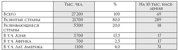 В странах «третьего мира» доля лиц с высшим образованием была на порядок меньше. Если в самодеятельном населении развитых стран кадры высшей и средней квалификации составляли 11,1 %, то в Латинской Америке 5,7 %, в Азии – 2,7 %. Научные работники и инженеры составили в первой половине 70-х гг. в развитых странах 112 на 10 тыс. населения, в Латинской Америке – 69, в Азии – 22, в Африке – 6. Однако и здесь она быстро росла (в частности, в странах ЮВА доля лиц с высшим образованием за 5 лет с 1965 по 1970 г. выросла в 5 раз – с 0,2 % до 1 %)73. К концу 70-х гг. 80 % лиц с высшим образованием было сосредоточено в развитых странах74.
