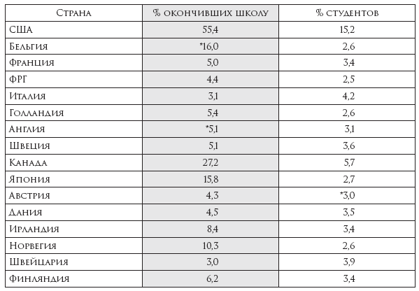 К 1988 г. процент студентов в возрастной когорте 20–24 лет достиг в США 59,6, в Англии – 22,8, во Франции – 34,8, в ФРГ – 31,8, в ГДР – 33,1, в Японии – 30,1, в СССР – 23,680.