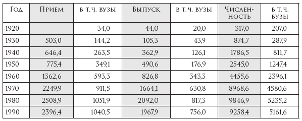 В СССР рост численности лиц с вышим образованием был более интенсивным, чем в большинстве развитых стран, кроме США, причем особенно быстро он шел в 30-х гг. и в 50—60-х гг. В 1939 г. полное высшее образование имели 1,2 млн человек (0,5 % во всем населении и 1,3 % в самодеятельном), в 1959 г. – 3,8 млн (1,8–2,3 % и 4,5 %), в 1970 г. – 8,3 млн (4,2 % и 6,5 %), в 1979 г. – 14,8 млн (6,8 % и 10 %), в 1989 г. – 23 млн (10,8 % и 14,3 %); среди лиц умственного труда доля таких лиц выросла с 7,6 % в 1939 г. до 16,5 % в 1959 г. и до 30,3 % в конце 70-х гг.63