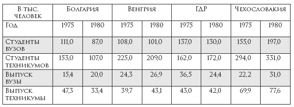 В восточноевропейских соцстранах проводилась, в принципе, аналогичная политика, лишь в несколько более скромных масштабах. В Польше число студентов выросло с 56 тыс. в 1945 г. до 150 тыс. в 1950 г., план на 1961–1980 гг. предусматривал четырехкратное увеличение, в т. ч. десятикратный рост на вечернем и заочном при дневном всего в 2,6 раза. Но т. к. пришлось значительно понизить требования к кандидатам, уровень, особенно на вечернем отделении, резко упал, и увеличился отсев103. В Румынии лиц с высших образованием в 1950 г. выпущено 8,4 тыс., в 1960 г. – 10,9 тыс., в 1970 г. – 24,5 тыс.; со средним специальным: в 1951 г. – 128 тыс., в 1961 г. – 151,1 тыс., в 1971 г. – 154 тыс.104 В Болгарии за 40 лет было выпущено 383,4 тыс. специалистов, и к 1984 г. имелось 86,3 тыс. студентов105. Темпы роста в ряде стран, как и в СССР, снизились только в конце 70-х гг., когда обнаружилось явное перепроизводство «специалистов» и наметился дефицит рабочих106: