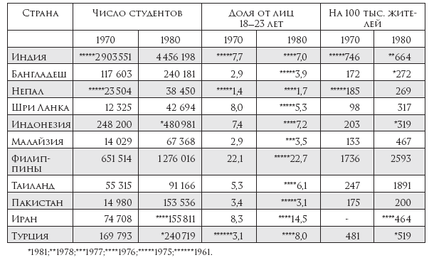 В 1977 г. в развивающихся странах Азии насчитывалось 7440 тыс. студентов (плюс 201 тыс. обучающихся за границей), Северной Африки – 727 тыс. (плюс 43 тыс.), Тропической Африки – 269 тыс. (плюс 70 тыс.). В частности, в Индонезии – 300 тыс., Южной Корее – 419 тыс., Турции – 313 тыс., Бангладеш – 182 тыс., Иране – 172 тыс., Индии – 2,5–3,2 млн, Египте – 493 тыс., Алжире – 62 тыс., Марокко – 67 тыс., Нигерии – 68 тыс., Судане – 24 тыс., Заире – 21 тыс.129 К началу 80-х гг. некоторые страны Юго-Восточной Азии по показателю доли студентов в населении стали приближаться к развитым странам. Численность студентов в основных азиатских странах в 1970–1980 гг. характеризуется следующими цифрами130: