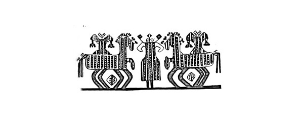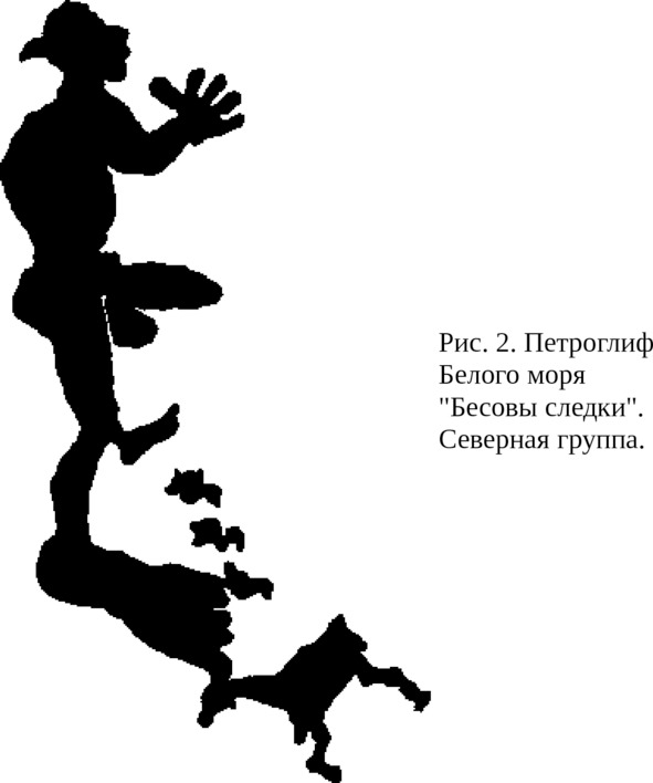 Как это не покажется парадоксально, для того чтобы ответить на этот вопрос, а заодно и на следующий – почему в индоиранской мифологии образ коня тесно связан с образом оленя, следует, по нашему мнению, обратиться к археологическим памятникам севера европейской части СССР. Именно здесь на рубеже мезолитической и неолитической эпох, на скалистых берегах Онежского озера и Белого моря появляются изображения, свидетельствующие о древней сакрализации образов водоплавающей птицы и оленя (лося), присутствующих постоянно в сценах, связанных с оплодотворением, рождением и смертью, имеющих мифологический, ритуальный характер. Причем именно здесь очень часто эти два образа – гуся и лося – перерастают один в другой. Таковы – ладьи с носовой частью в виде рогатой лосиной головы на длинной гусиной шее, гусь с лосиными рогами, рогатые гуси, лось во главе идущих в ряд гусей, изображение лося среди гусей (рис. 1, 2, 3). Исключительный интерес представляет связь образов этих животных с антропоморфными персонажами данных неолитических петроглифов. Таковы распластанная в позе роженицы антропоморфная фигура, нога которой перерастает в тело гуся, и уникальное изображение мужчины (главного персонажа в композиции так называемых «Весовых следков» на Белом море) с одним рогом на затылке, большой палец громадной ступни которого соприкасается с фигурой молодого, еще безрогого лося, а мизинец – с группой из трех водоплавающих птиц (гусей или уток) (рис. 2).